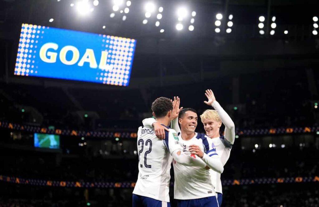 افتتح ميكي فان دي فين التسجيل لتوتنهام في الدقيقة 19 برأسية قوية بعد كرة عرضية من رودريغو بنتانكور إثر ركلة ركنية نفذها محمد قدوس. ولم يكتفِ المدافع الهولندي بهذا الهدف، بل عاد ليضاعف النتيجة للسبيرز في الوقت المحتسب بدل الضائع للشوط الأول، محولاً عرضية متقنة من بيدرو بورو برأسية أخرى إلى الشباك، ليؤكد سيطرة توتنهام على مجريات اللعب.