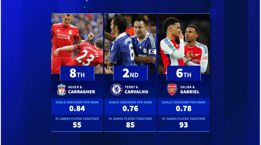 يتصدر القائمة، وربما ليس من المستغرب، أحد أكثر شراكات قلوب الدفاع احترامًا على الإطلاق، ثنائي مانشستر يونايتد، ريو فرديناند ونيمانيا فيديتش، اللذين لعبا 120 مباراة في الدوري الإنجليزي الممتاز معًا، وسجلا 0.71 هدف مستقبَل في المباراة الواحدة فقط.