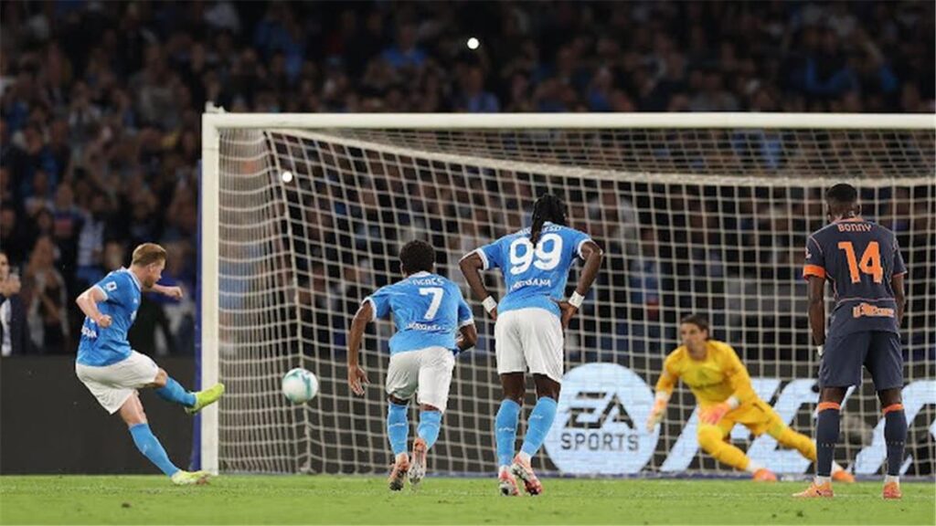استضاف ملعب “دييجو أرماندو مارادونا” هذه المواجهة النارية التي جمعت بين نابولي وإنتر ميلان. وفي الدقيقة 31 من عمر الشوط الأول، احتسب حكم اللقاء ضربة جزاء لصالح نابولي بعد العودة لتقنية الفيديو المساعد (VAR). تقدم النجم البلجيكي كيفين دي بروين لتنفيذ الركلة بنجاح، مسجلاً هدف التقدم لنابولي في الدقيقة 33 ليضع فريقه في المقدمة.